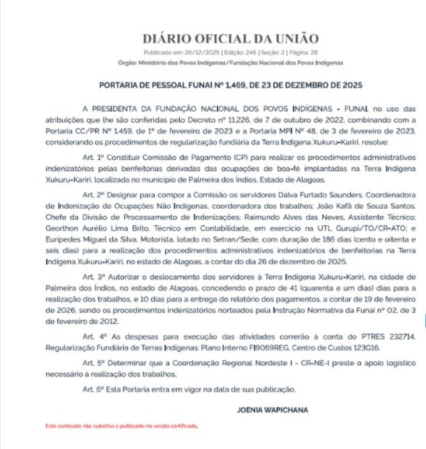 A Fundação Nacional dos Povos Indígenas publicou no Diário Oficial da União desta quinta-feira (26) a Portaria de Pessoal nº 1.469, de 23 de dezembro de 2025, que institui a Comissão de Pagamento (CP) responsável pelos procedimentos administrativos de indenização de benfeitorias decorrentes de ocupações de boa-fé na Terra Indígena Xukuru-Kariri.