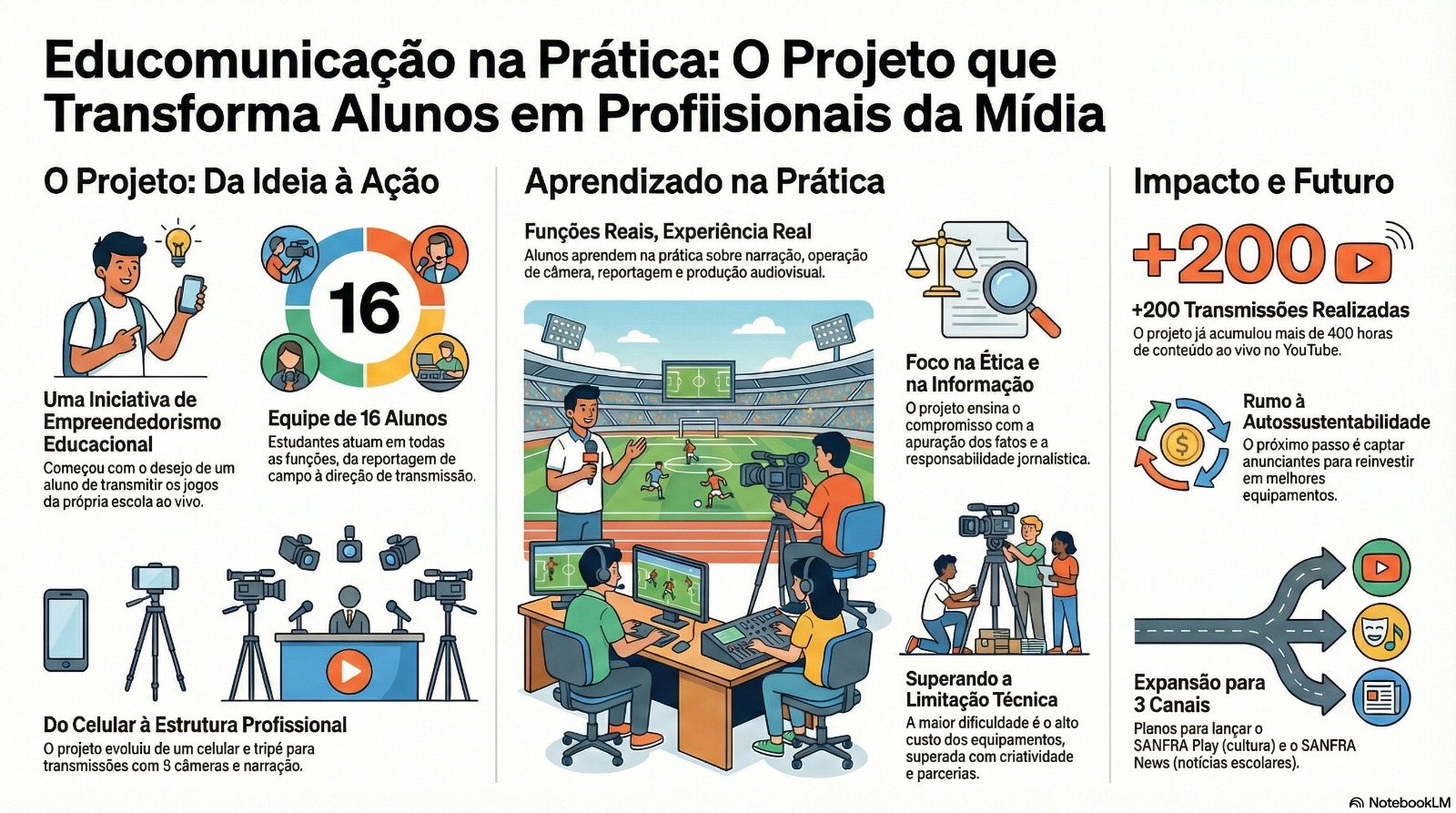 O que chama a atenção no projeto apresentado por Mário Zeymison é o rigor profissional aplicado ao aprendizado. Longe de ser apenas uma brincadeira com celulares, o Sanfra funciona como uma "empresa estudantil". Os 16 alunos envolvidos na equipe prática se revezam em funções complexas, que vão desde a operação de câmeras e direção de transmissão até a reportagem de campo e narração.