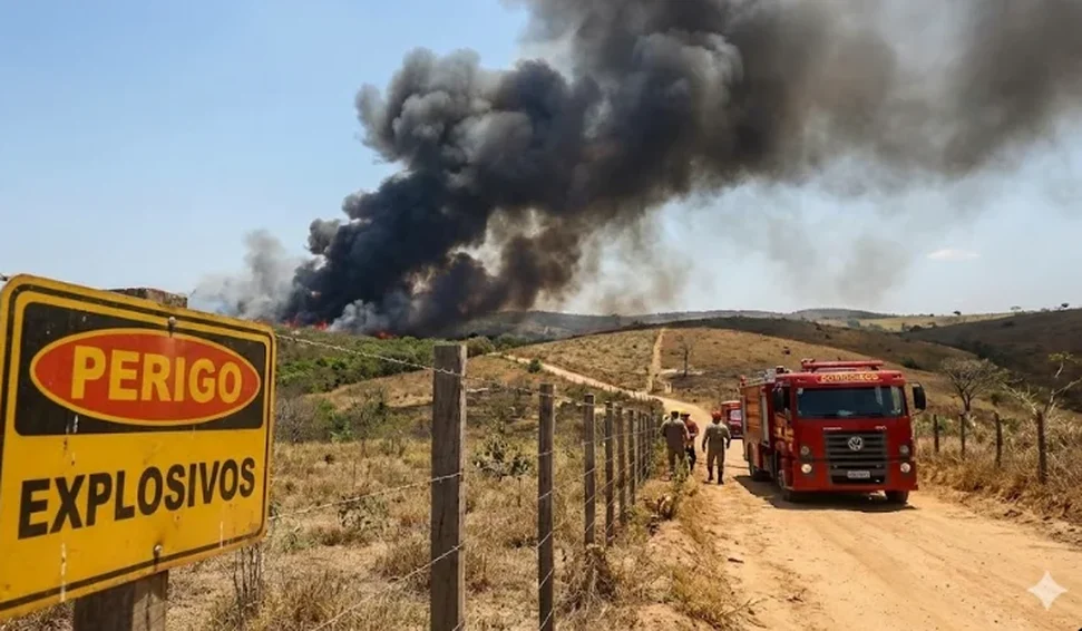O ponto crítico da ocorrência é o risco envolvido: o local possui armazenamento de explosivos utilizados na atividade de mineração. A proximidade do fogo com esse material eleva o grau de perigo e exige cautela total.