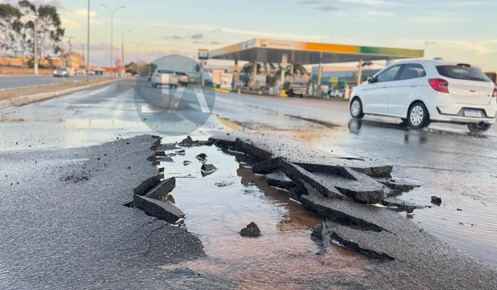 De acordo com informações colhidas no local, a cratera se formou exatamente na pista que dá acesso ao posto rodoviário. O asfalto cedeu de forma visível, comprometendo parte da via, enquanto a água proveniente da tubulação rompida escorre pelos dois lados da rodovia, agravando a situação e aumentando o risco de novos danos à estrutura do pavimento.