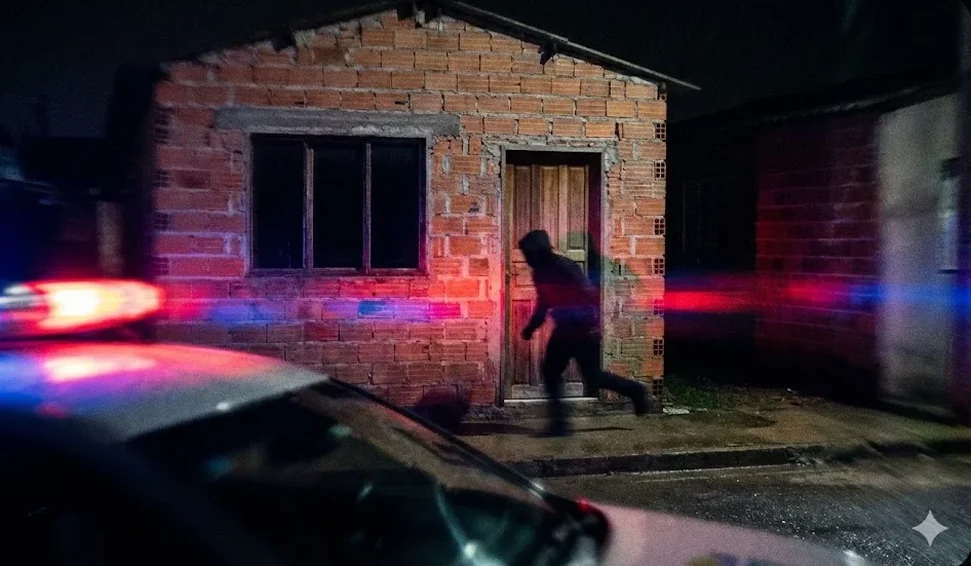 Ao chegarem ao local indicado, os militares avistaram o suspeito em frente a uma residência. A reação dele foi imediata: ao perceber a aproximação das viaturas, o homem demonstrou extremo nervosismo, levantou-se bruscamente e tentou correr para o interior do imóvel na tentativa de escapar da abordagem.