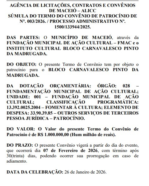 A autorização do repasse foi publicada no Diário Oficial do Município por meio da Fundação Municipal de Ação Cultural (FMAC). O convênio firmado tem como objeto exclusivo o patrocínio do desfile do bloco, um dos mais tradicionais do pré-carnaval de Maceió, e estabelece que os recursos serão custeados com verba própria da fundação, dentro da rubrica orçamentária destinada ao fomento à cultura.