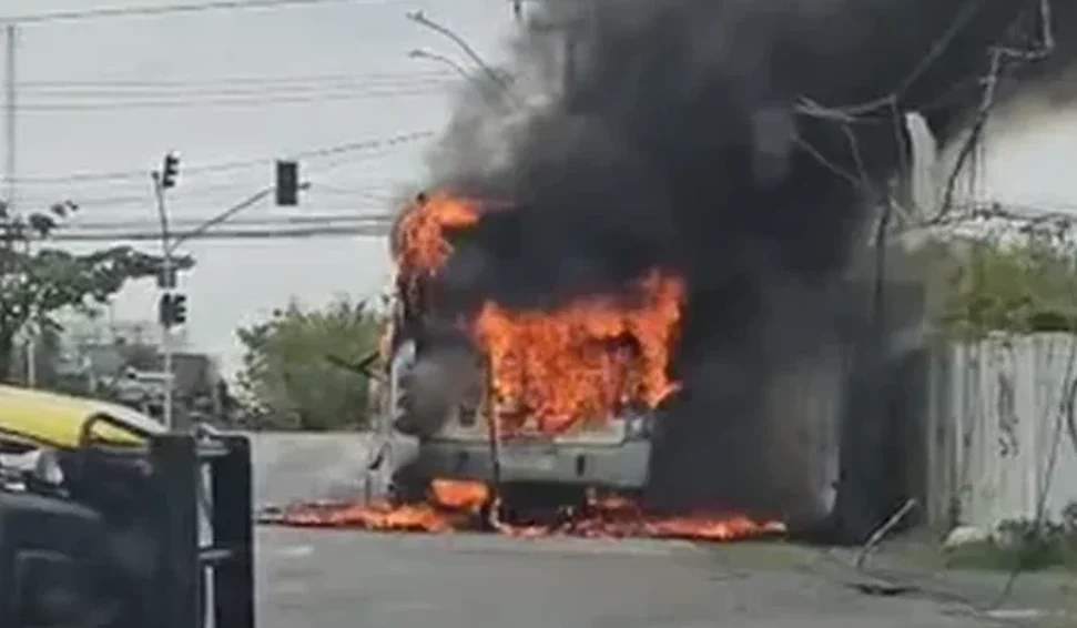 Pânico no Feitosa: ônibus coletivo é destruído pelo fogo na Avenida Juca Sampaio; passageiros escaparam ilesos