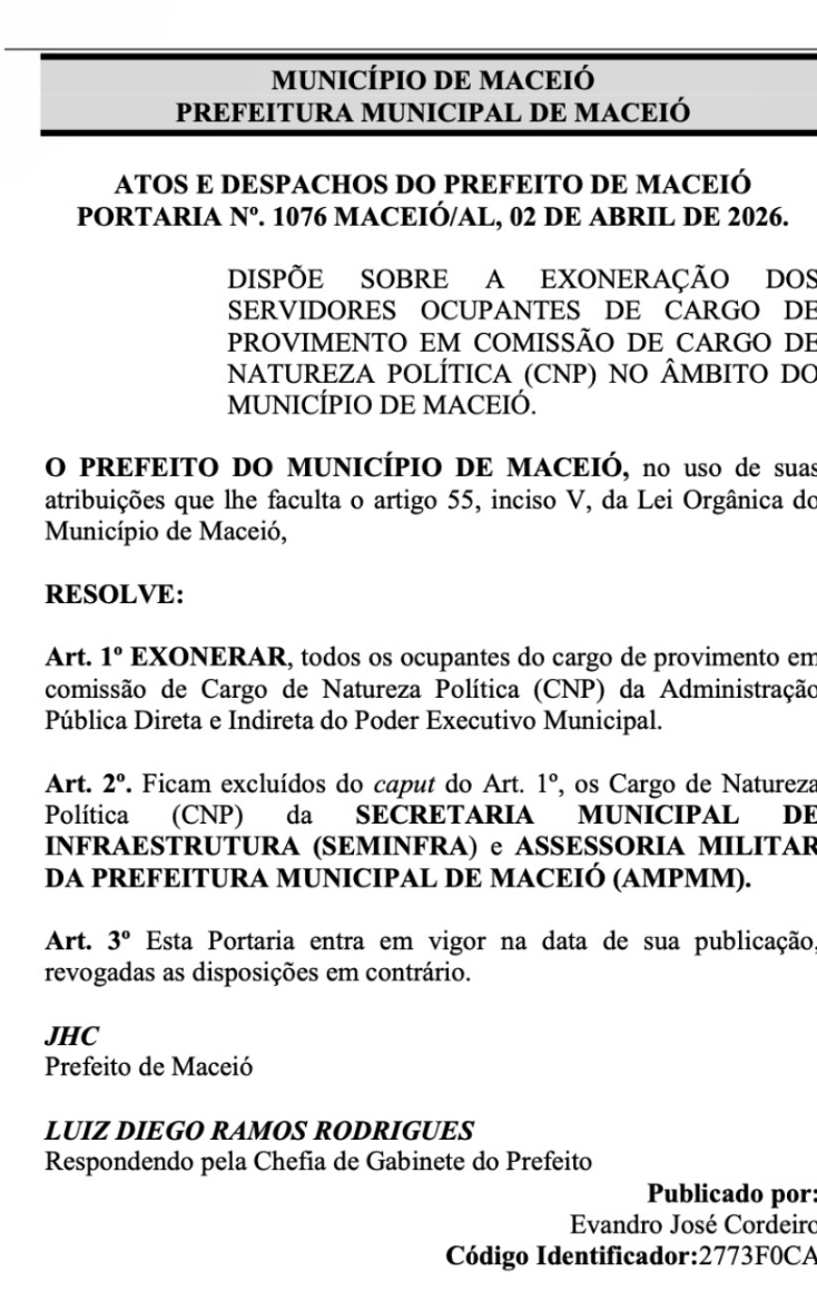 A poucos dias de deixar o comando da Prefeitura de Maceió para disputar as eleições de outubro, o prefeito João Henrique Caldas (JHC) publicou, no Diário Oficial desta quinta-feira (2), uma medida de forte impacto administrativo e político: a exoneração de todos os ocupantes de cargos comissionados de natureza política (CNP) no âmbito da administração municipal.