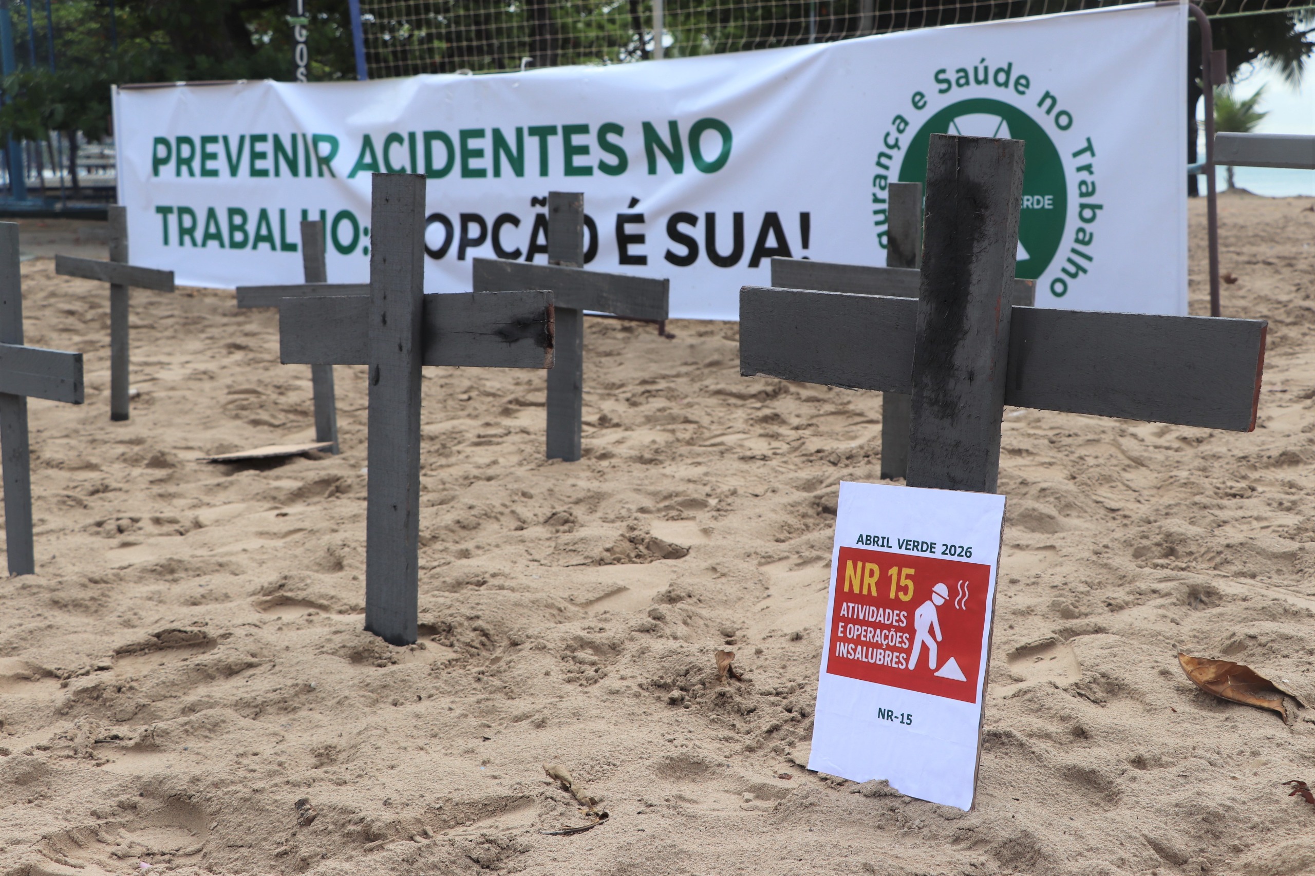 Maceió/AL – O Movimento Abril Verde deu início à campanha “A Segurança do Trabalho pede Socorro” nesta segunda-feira (6), colocando mais de cem cruzes na Praia de Pajuçara, em Maceió, para lembrar das vítimas de acidentes de trabalho no Estado de Alagoas. O ato simbólico foi a primeira das três ações que ocorrerão ao longo do mês, sempre com o foco na prevenção como meio de garantir a saúde e a segurança do trabalhador.