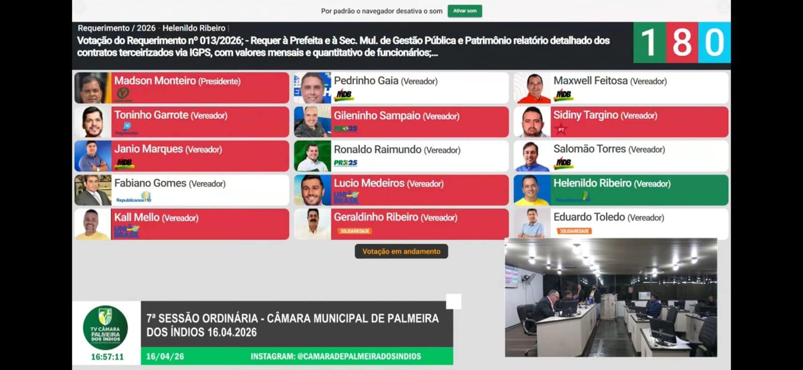 A Câmara Municipal de Palmeira dos Índios rejeitou, na sessão ordinária desta quinta-feira, 16 de abril, um requerimento de autoria do vereador Helenildo Ribeiro Neto (REP) que solicitava à prefeita e à Secretaria Municipal de Gestão Pública e Patrimônio um relatório detalhado dos contratos terceirizados mantidos via IGPS, com indicação dos valores mensais, do quantitativo de funcionários e da relação nominal dos trabalhadores vinculados ao instituto.