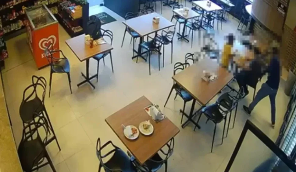 Segundo imagens de segurança, o suspeito estava dentro do estabelecimento e aproveitou um momento de distração para abordar a vítima por trás, enquanto o agente estava acompanhado de uma criança.
