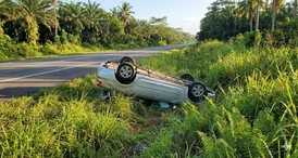 Veículo saiu da pista e parou com as rodas para cima em área de vegetação; condutora trabalha na região e recebeu atendimento médico no local