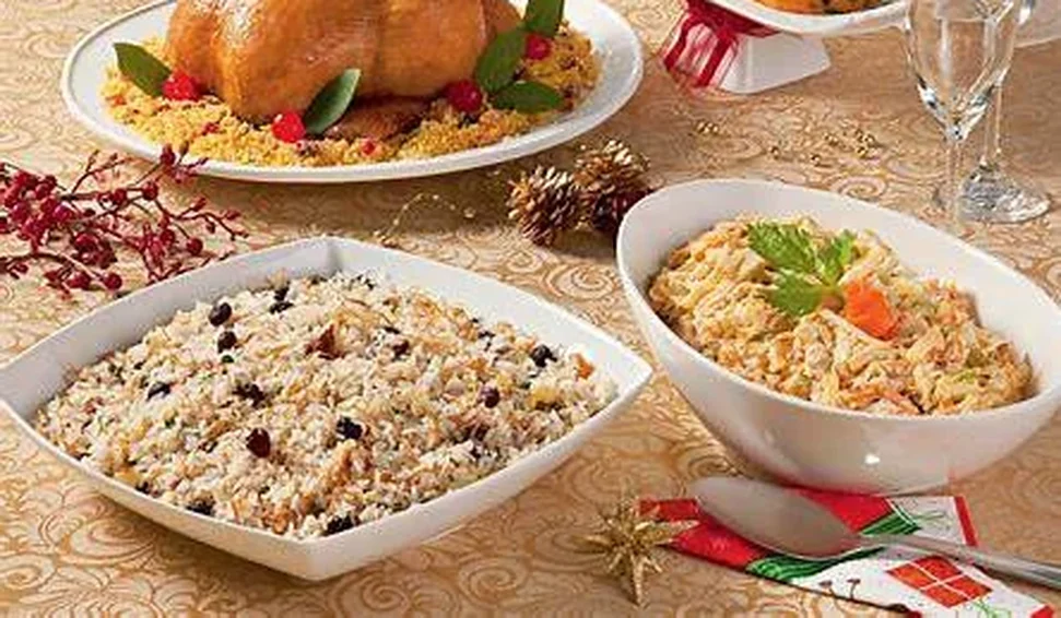 Arroz com passas e farofa: acompanham as carnes e simbolizam partilha.