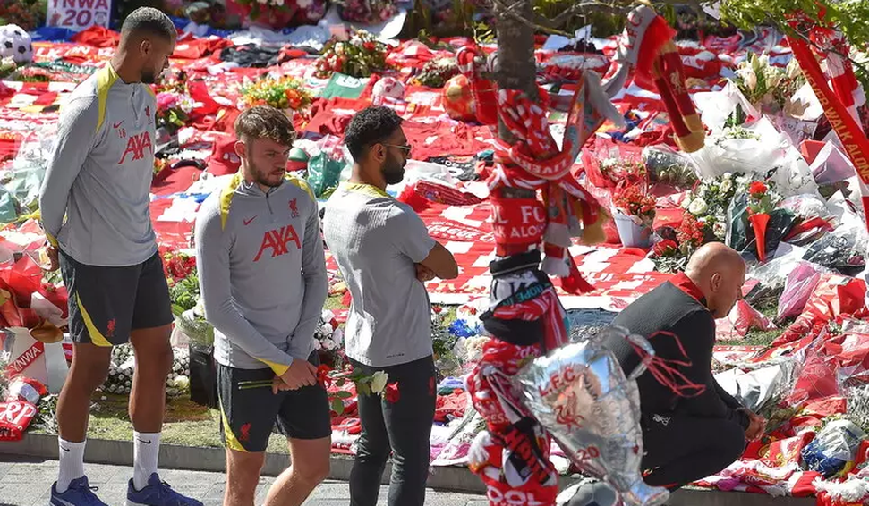 Na oportunidade, os jogadores depositaram flores em uma via recheada de camisas, cachecóis, bandeiras e balões de coração colocadas por torcedores em homenagem a Jota, que defendia o clube britânico, e Silva, do Penafiel.