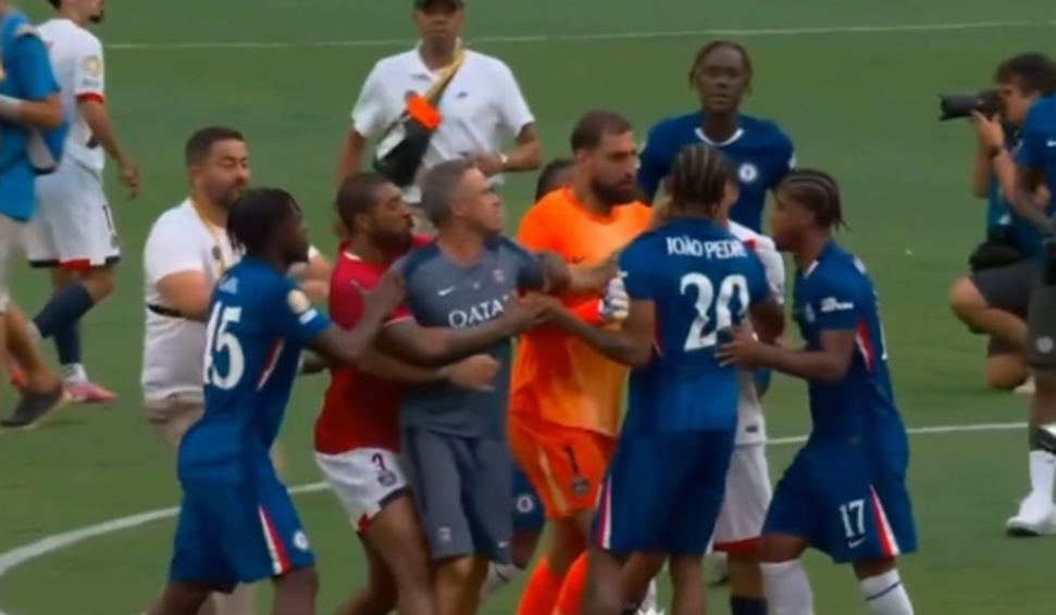 O momento mais lamentável aconteceu num desentendimento entre o goleiro Gianluigi Donnarumma e João Pedro. Luis Enrique, técnico do PSG, interferiu e acabou acertando um tapa no rosto do reforço brasileiro do Chelsea, que caiu no chão com as mãos no rosto.
