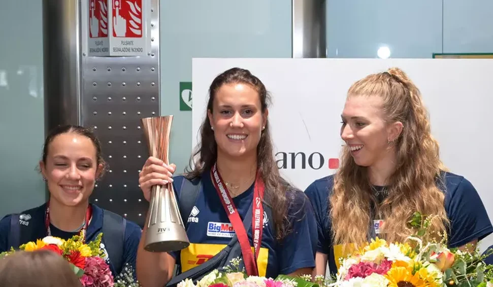 A seleção italiana de vôlei feminino foi recebida com festa no Aeroporto de Milão-Malpensa nesta segunda-feira (8), um dia após o histórico título no Mundial da Tailândia.