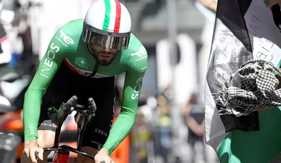 O campeão olímpico de Tóquio completou a etapa de 12,2 quilômetros em exatos 13 minutos, um tempo reduzido em mais da metade pelos organizadores para evitar protestos de apoiadores pró-Palestina.