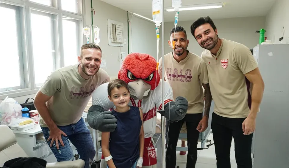 Em comemoração aos 113 anos de história, o Clube de Regatas Brasil promoveu uma manhã especial na Oncologia Pediátrica da Santa Casa de Maceió, nesta sexta-feira (12). Jogadores do elenco, membros da diretoria e o mascote Galo de Campina visitaram crianças em tratamento contra o câncer, levando mensagens de força e esperança.