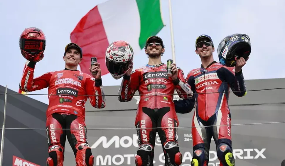 A Ducati está em festa neste domingo (28) com a dobradinha no pódio do Grande Prêmio do Japão de MotoGP: o italiano Francesco Bagnaia venceu a corrida e o espanhol Marc Márquez conquistou seu nono título mundial, sendo o sétimo na categoria rainha.