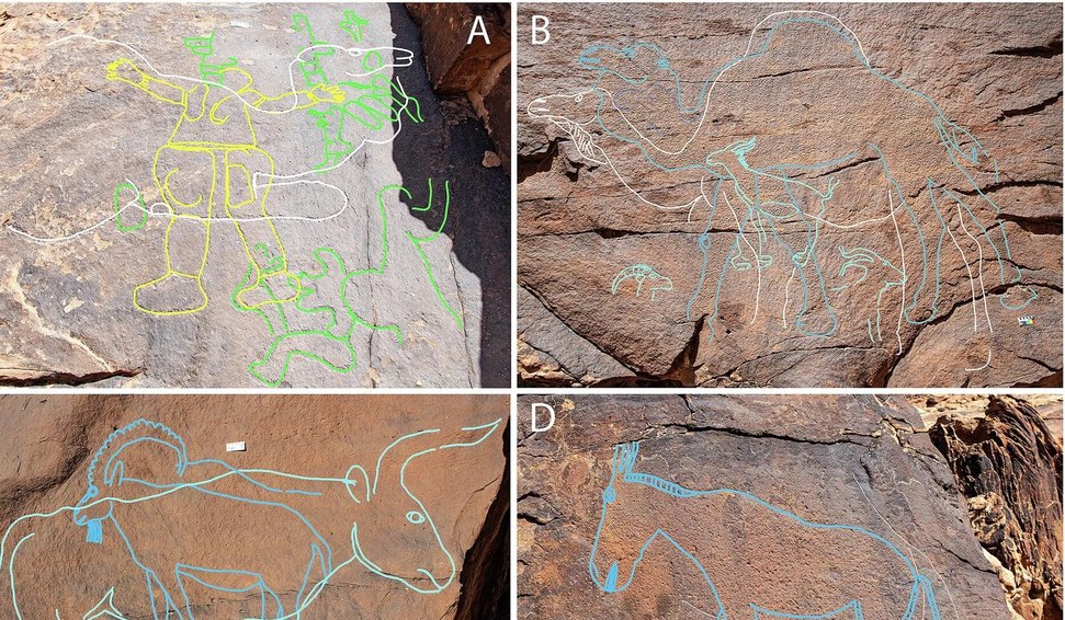 Foram identificados mais de 60 painéis de arte rupestre em três áreas até então inexploradas — Jebel Arnaan, Jebel Mleiha e Jebel Misma — na borda sul do deserto de Al-Nafud. Ao todo, os cientistas catalogaram 176 gravuras, entre elas 130 figuras em tamanho real de camelos, íbex, gazelas, auroques e cavalos primitivos, algumas chegando a três metros de comprimento e mais de dois de altura.