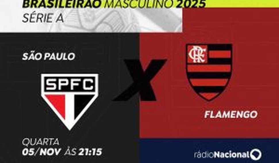 A Rádio Nacional transmite, ao vivo, nesta quarta-feira (5), o confronto entre São Paulo e Flamengo, válido pela 32ª rodada do Campeonato Brasileiro Série A. O jogo será disputado na Vila Belmiro, em Santos, a partir das 21h30.