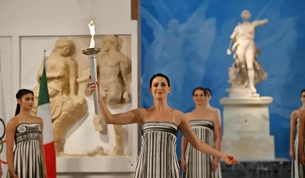Após o acendimento, a "grande sacerdotisa" ofereceu a chama para o primeiro condutor, o remador grego Petros Gkaidatzis, medalhista de bronze nas Olimpíadas de Verão de Paris, em 2024, e que acendeu a tocha dos Jogos de Milão-Cortina.