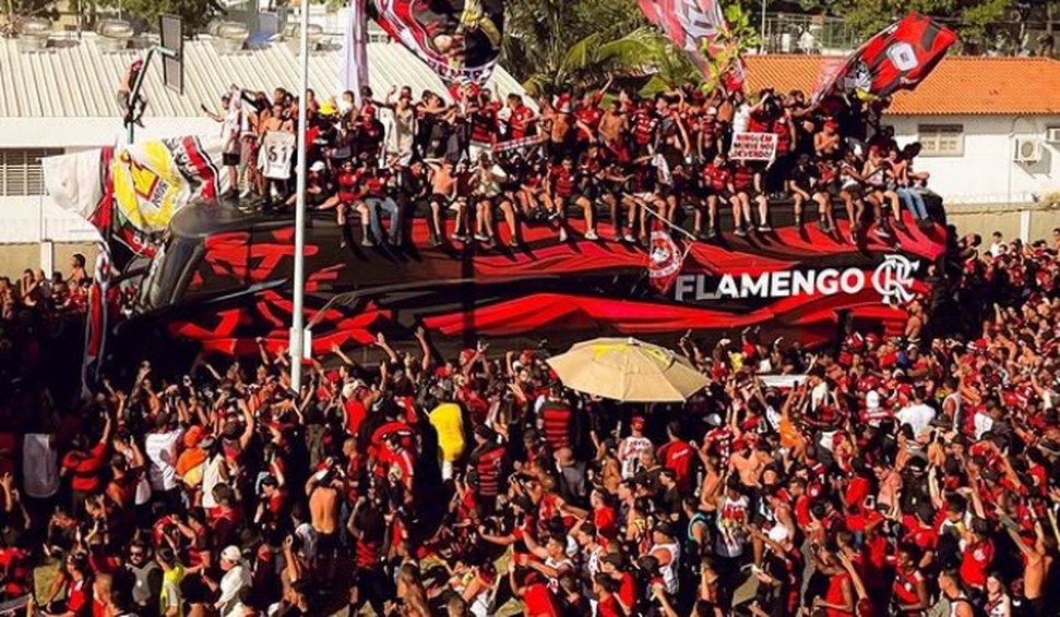 O clima de festa, porém, deu lugar à confusão. Em determinado momento, torcedores subiram no ônibus da delegação, chegaram a entrar pelo teto do veículo e tiraram fotos com jogadores como o zagueiro Léo Pereira e o atacante Luiz Araújo.
