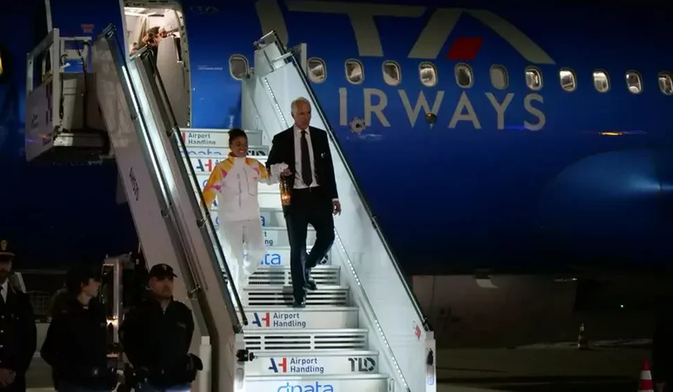 A tenista italiana Jasmine Paolini e o presidente da Fundação Milão-Cortina, Giovanni Malagò, desceram da aeronave com a tocha. O chefe do Comitê Olímpico Nacional Italiano (Coni), Luciano Buonfiglio, também estava a bordo.
