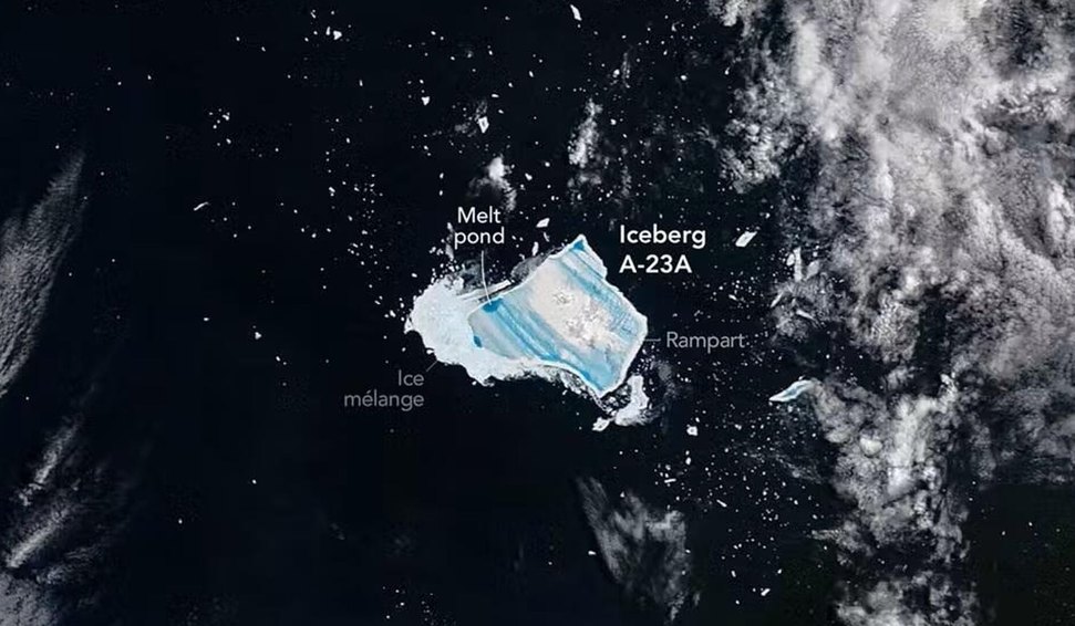O iceberg A-23A, considerado um dos maiores e mais antigos do planeta, está derretendo rapidamente e acumulando água de degelo, segundo imagens recentes divulgadas pela NASA.