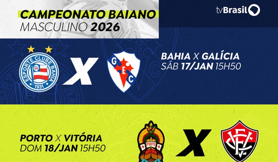 A TV Brasil transmite, neste fim de semana, dois confrontos da terceira rodada do Campeonato Baiano 2026: Bahia x Galícia e Porto-BA x Vitória. As partidas serão exibidas para todo o país, com sinal gerado pela emissora parceira, TVE Bahia, que integra a Rede Nacional de Comunicação Pública (RNCP).