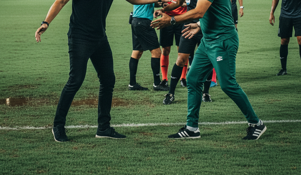 O clima esquentou na saída para o intervalo, com discussão entre os técnicos Alberto Valentim e Jorge Sampaoli, além de jogadores. O bate-boca foi controlado rapidamente.