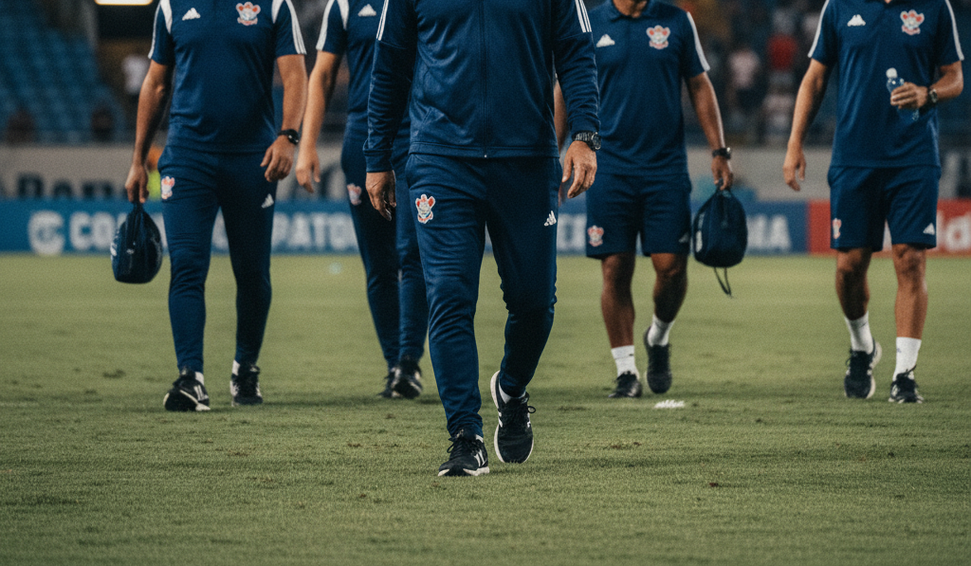 Presidente Pedrinho anuncia saída do treinador e comissão técnica após revés no clássico e confirma Bruno Lazaroni como interino.