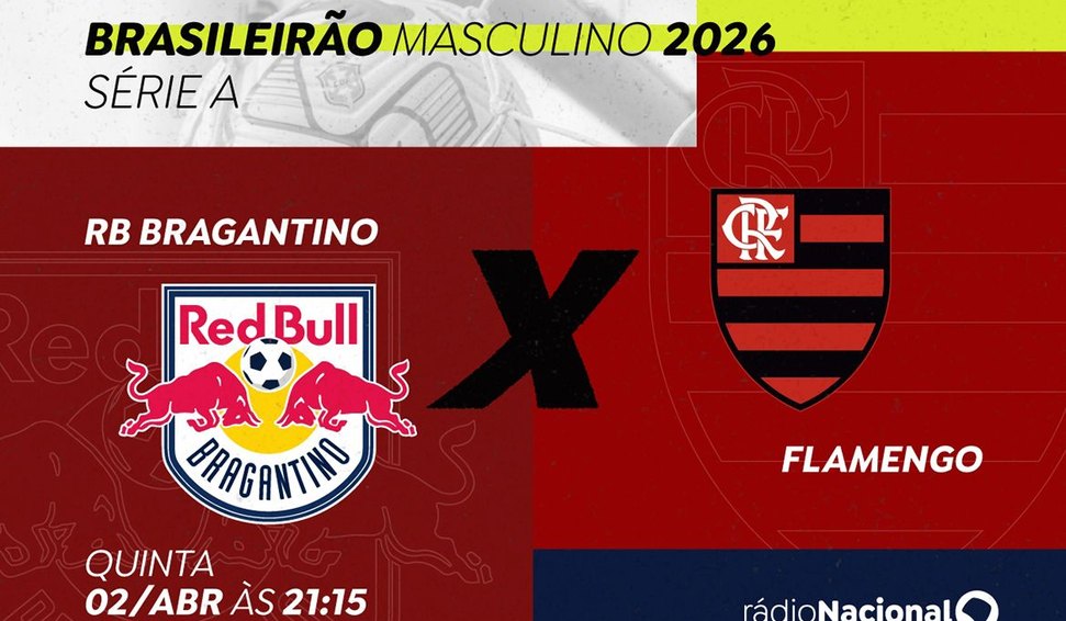 Campeonato Brasileiro 2026 – RB Bragantino x Flamengo, quinta (2), a partir das 21h15, na Rádio Nacional RJ, AM, OC e AS + RNCP e Parceiros. Além disso, a partida também será transmitida pelo canal da Rádio Nacional no YouTube .