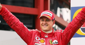 Com ajuda da esposa, Schumacher assina capacete em rara aparição em tributo da F-1