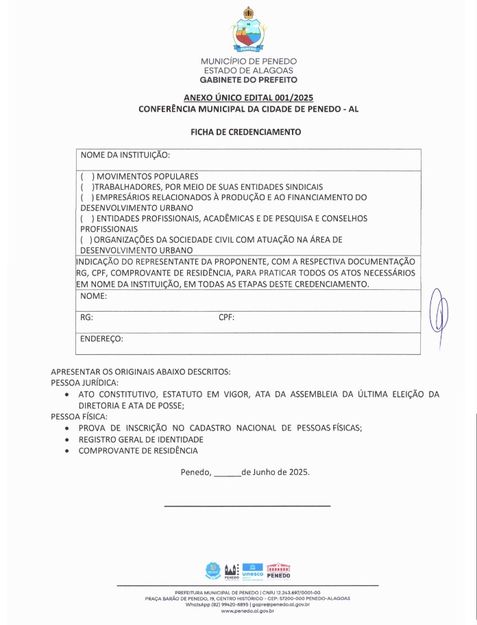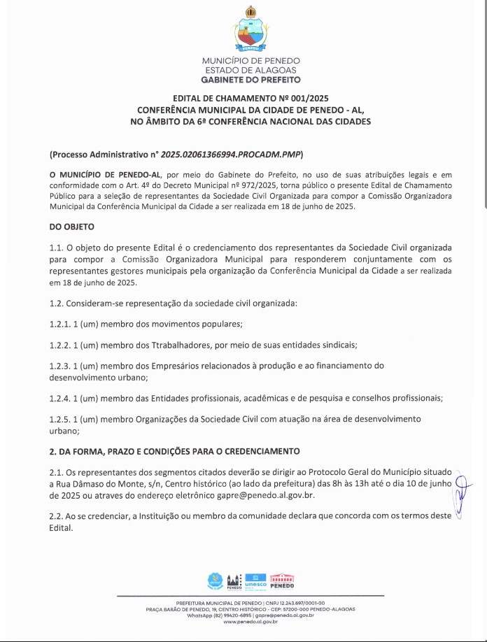 A Prefeitura de Penedo lançou o Edital de Chamamento Nº 001/2025, convocando representantes da sociedade civil organizada para compor a Comissão Organizadora Municipal da Conferência Municipal da Cidade, evento que será realizado em 18 de junho.