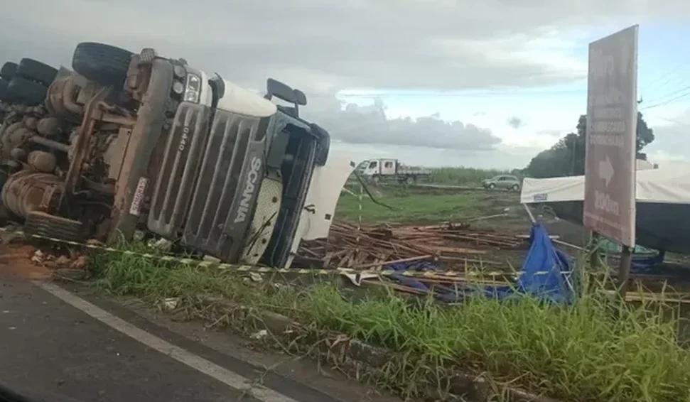 Um grave acidente registrado na noite deste domingo (15) resultou na morte de um motorista de 43 anos, após o capotamento de uma carreta carregada com madeira na rodovia BR-316, no município de Pilar, Região Metropolitana de Maceió.