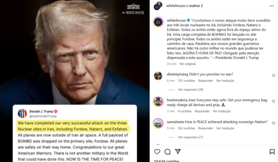 Trump escreveu que "todos os aviões estão agora fora do espaço aéreo iraniano" após lançarem uma “carga completa de bombas” sobre Fordow — um dos complexos subterrâneos mais protegidos do programa nuclear do Irã. "Parabéns aos nossos grandes guerreiros americanos. Não há outro militar no mundo que pudesse ter feito isto. AGORA É HORA DE PAZ!", completou.