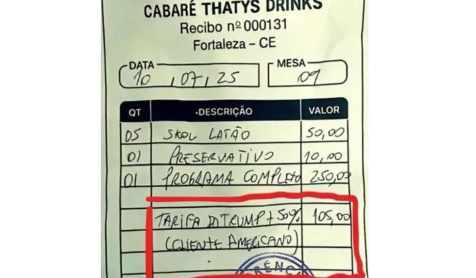 Um recibo inusitado de um cabaré localizado em Fortaleza (CE) está movimentando as redes sociais. No documento, que circula em grupos e plataformas digitais, o estabelecimento aplica uma cobrança extra de 50% a um cliente norte-americano — supostamente como forma de protesto ao aumento tarifário imposto pelo governo dos Estados Unidos aos produtos brasileiros.