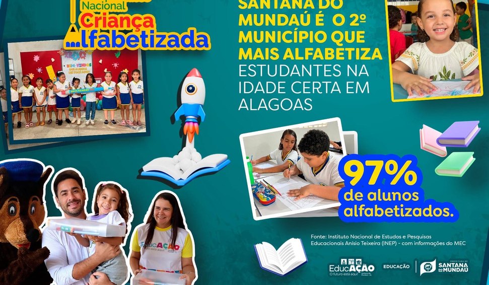 Nos índices de alfabetização, referente aos alunos com até 8 anos, o Ministério da Educação (MEC), divulgou na última semana, que com 97% das crianças alfabetizadas na idade certa em 2024, Santana do Mundaú é o 2º município que mais alfabetiza em Alagoas.