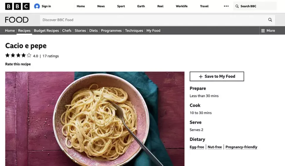 A seção dedicada à gastronomia "Good Food", no site da BBC, descreveu o prato romano icônico como uma receita que "não pode faltar na sua despensa" e "que poderia ser facilmente preparada para um almoço rápido", com apenas "quatro ingredientes simples: espaguete, pimenta, parmesão e manteiga".