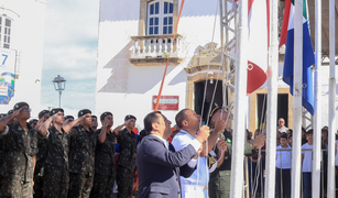 Escolas da Secretaria Municipal de Educação (SEMED) abrilhantaram a cerimônia de hasteamento dos pavilhões na Praça Barão de Penedo, Centro Histórico, com o vice-prefeito Valdinho Monteiro representando o prefeito Ronaldo Lopes.