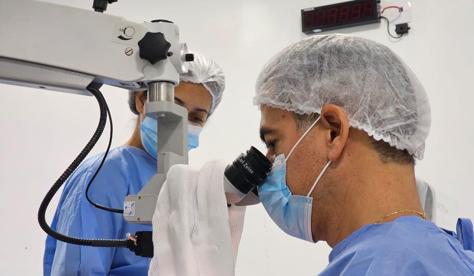 Desde a triagem no município até o momento da cirurgia, os pacientes contam com o suporte completo dos profissionais do Olhar da Gente e do Hospital da Cidade, realizando exames pré-operatórios, pós-operatórios, entrega de óculos escuros e medicamentos, garantindo o cuidado integral com o paciente.