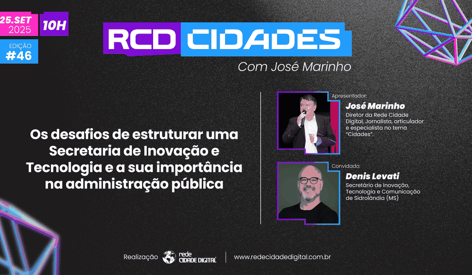 Os desafios de estruturar uma Secretaria de tecnologia e inovação na administração pública e o seu papel no desenvolvimento dos municípios é o tema do RCD Cidades desta quinta-feira (25), às 10 horas, o programa de entrevistas da Rede Cidade Digital (RCD), conduzido pelo diretor José Marinho.