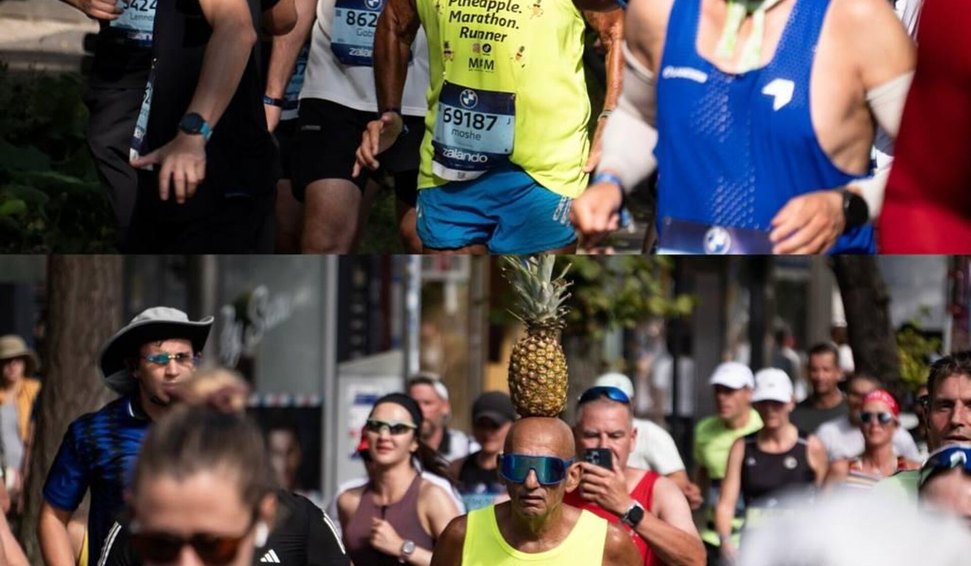 Equilíbrio e resistência: corredor realiza Maratona de Berlim com abacaxi na cabeça