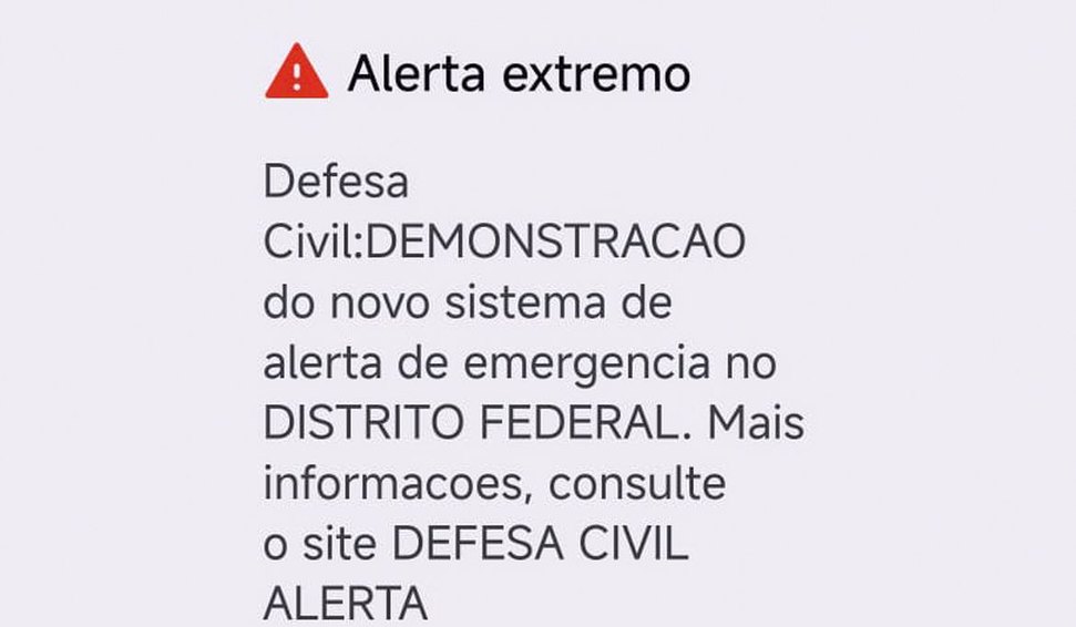 "Defesa Civil: Demonstração do novo sistema de alerta de emergência no Distrito Federal. Mais informações, consulte o site Defesa Civil Alerta", diz a mensagem.