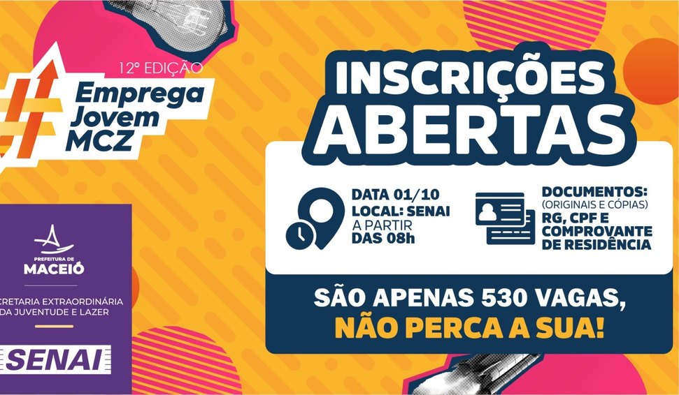 A Prefeitura de Maceió alcançou um novo marco com a 12ª edição do programa Emprega Jovem, desenvolvido pela Secretaria Extraordinária da Juventude e Lazer (SEJL). Os interessados devem comparecer, nesta quarta-feira (1°), a partir das 8h, no Senai Poço. São oferecidas 530 vagas. É preciso estar em mãos com o RG, CPF, comprovante de residência, originais e cópia.