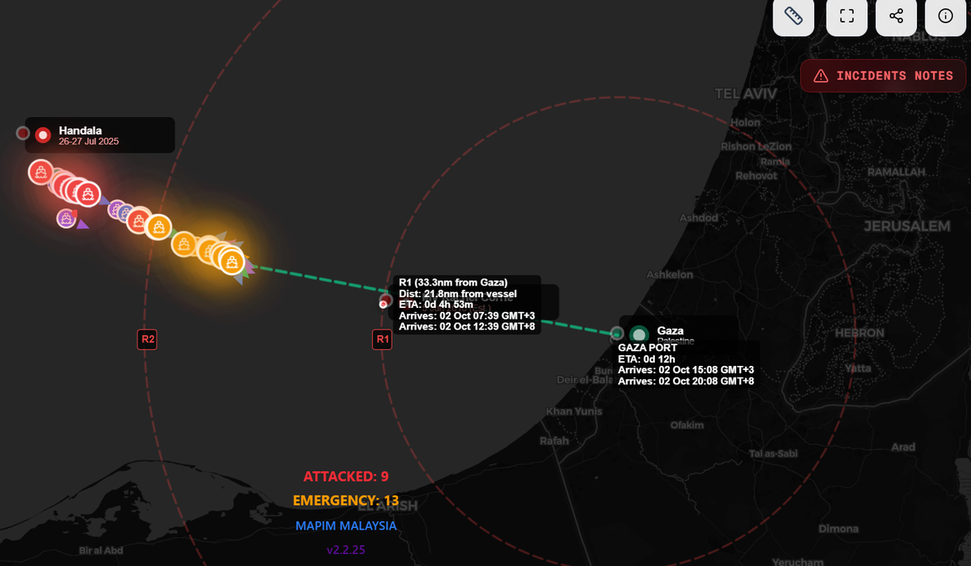 "Nenhuma regra do direito internacional autoriza ataques a embarcações em livre navegação em águas internacionais. A missão da flotilha é pacífica, humanitária e legal." A nota também cobra dos países que seja garantida a passagem segura da flotilha até a chegada a Gaza para a entrega dos itens de ajuda humanitária.