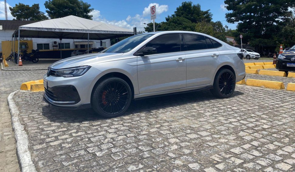 O automóvel, modelo Virtus, foi abordado e autuado. O condutor foi orientado a comparecer ao DMTT para regularizar o veículo, substituindo o escapamento modificado pelo original, já que a alteração não constava no documento (CRLV).
