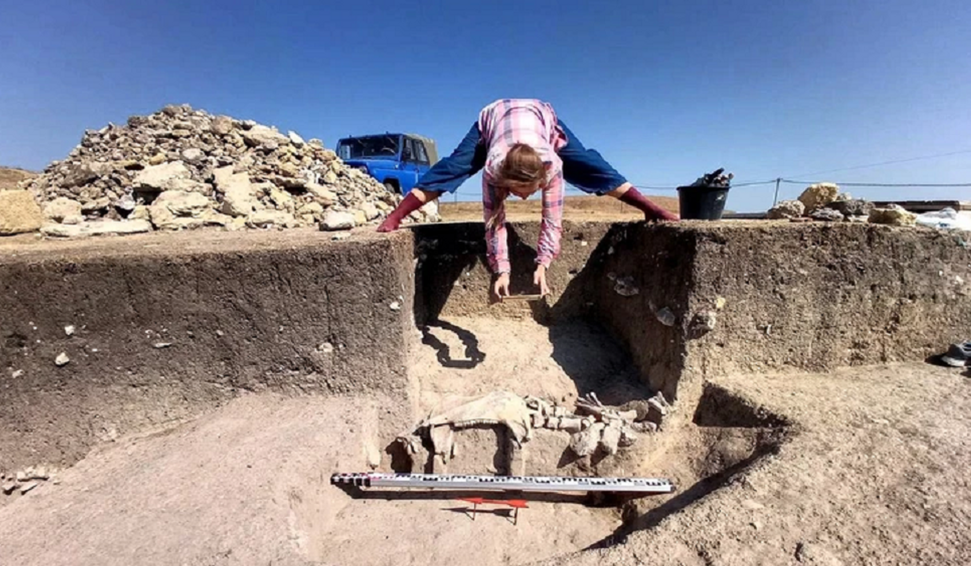 A descoberta do grafite não é a única descoberta convincente desta temporada. Entre uma série de fossos sacrificiais ligados a um sepultamento de alto status, arqueólogos descobriram os restos desmembrados de um jovem garanhão.