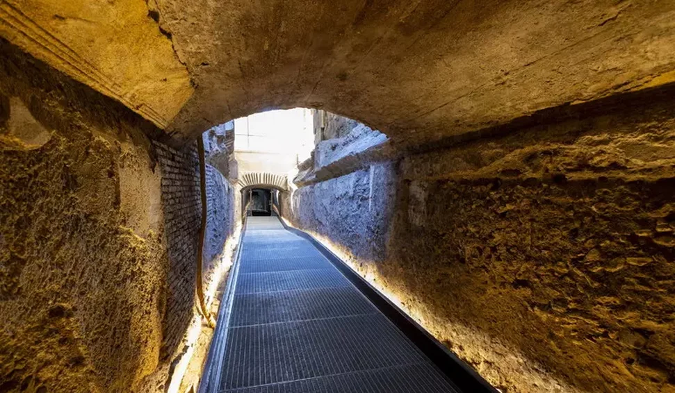 O corredor secreto foi descoberto e escavado em 1810 e sabe-se que foi construído entre os últimos anos do reinado de Domiciano (81-96 d.C.) e Trajano (98-117 d.C.).