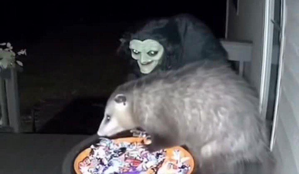 Gambá planeja encher a barriga durante banquete de Halloween, mas quase morre de susto com decoração