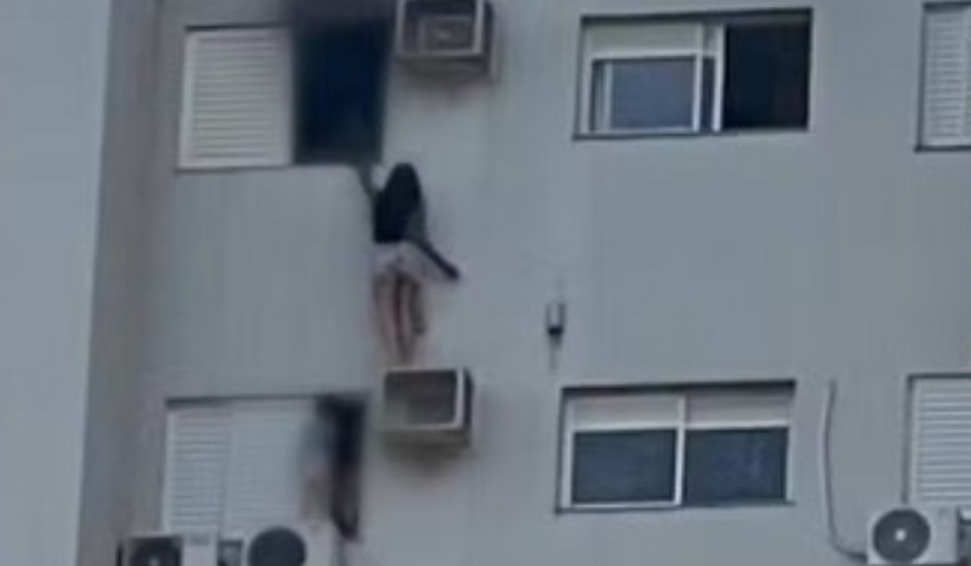 Uma mulher arriscou a vida ao se pendurar no suporte do ar-condicionado do 12º andar de um prédio para salvar a mãe, de 51 anos, e uma criança de 4 anos de um incêndio no apartamento que fica no 13º andar do edifício, em Cascavel (PR).