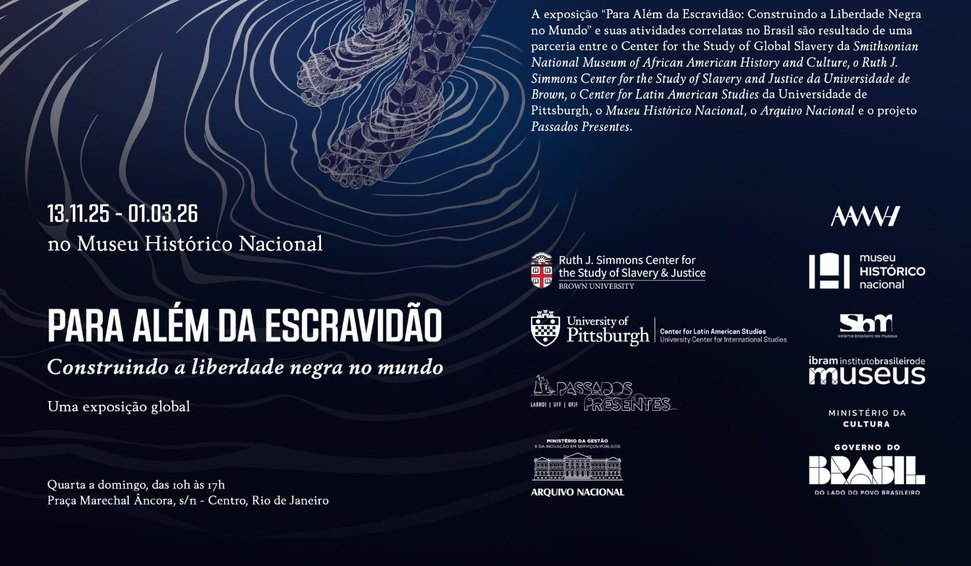 OUTRAS ATIVIDADES – O Arquivo Nacional e o Museu Histórico Nacional promoverão o seminário internacional Para além da escravidão: memória, justiça e reparação, com participação dos curadores da exposição, do presidente da Fundação Smithsonian e de especialistas brasileiros (dias 13 e 14 de novembro). O Arquivo Nacional também abrigará a exposição Senhora Liberdade: mulheres desafiam a escravidão. Montada com documentos, fotografias e vídeos do acervo da instituição, a mostra ficará aberta para visitação gratuita de 14 de novembro deste ano a 30 de abril de 2026.