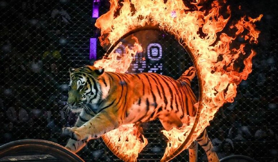 Tigre impressiona ao apresentar número circense em ensaio aberto no Circo de Moscou